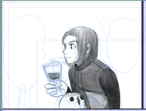 カミュセニャっぽい??画像もあげとこう。。 グレーの太い線がラフ、ブルーが下書き、セニャちゃんあたりの黒くて細いペンがペン入れ、適宜下書き2など挟みつつ作業。工程を行きつ戻りつでございます。